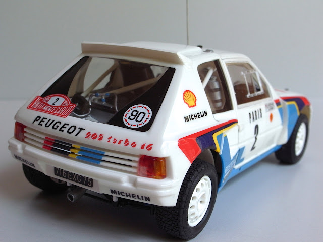 ボディ部分のデカールを貼りました。あたりまえですが、貼ると俄然レーシングカーらしくなります。シュンコーモデルのデカールは非常に発色が良く、隠蔽力も高いです。ゼッケン部などの白い面も下地の影響はほとんど受けません。貼った後で濃紺の塗り分けの上つらはもう少し上であることに気がつきました。。この状態からの修正はきびしいので、このまま進めます。